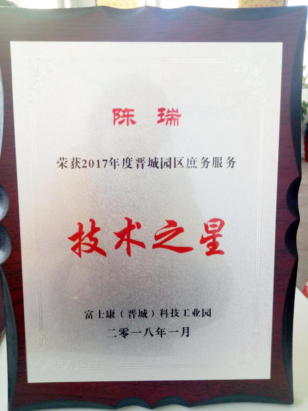 近日,在富士康(晉城)科技工業(yè)園舉辦的2017年度晉城園區(qū)庶務(wù)服務(wù)年終評比中,我公司員工陳瑞榮獲“技術(shù)之星“的稱號,這份榮譽(yù)是陳瑞總結(jié)日常工作所得經(jīng)驗再加上自身的刻苦鉆研,勤勞肯干的精神取得的。