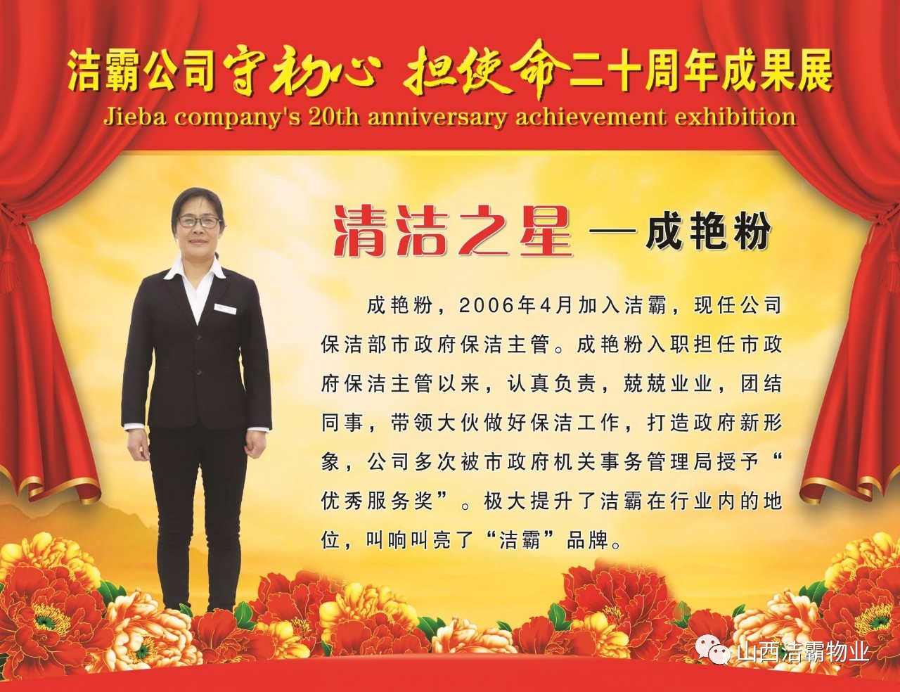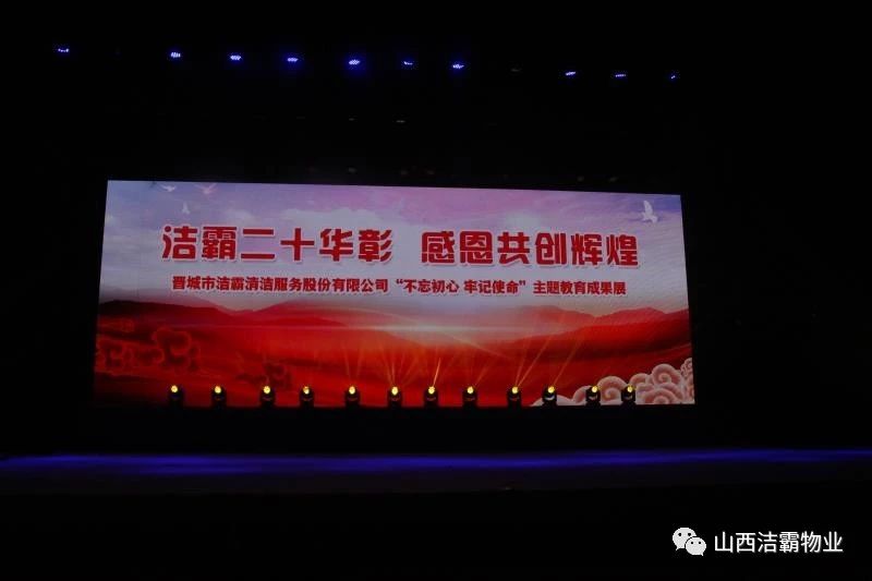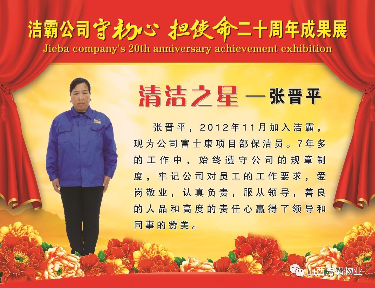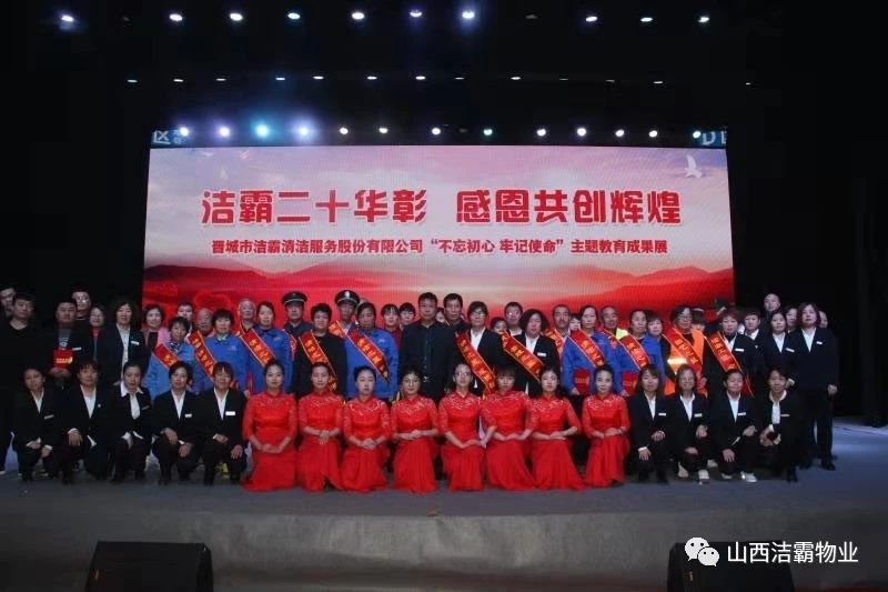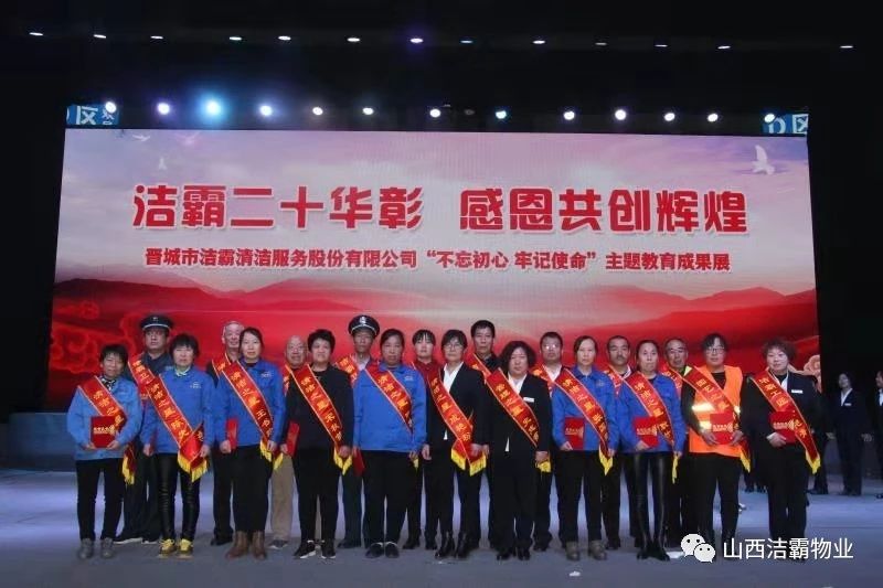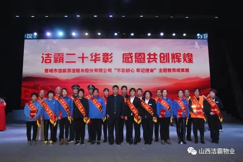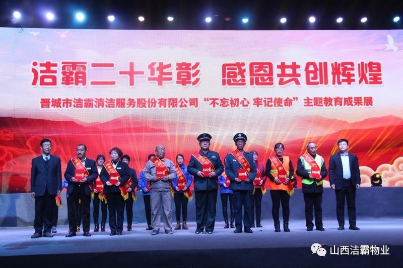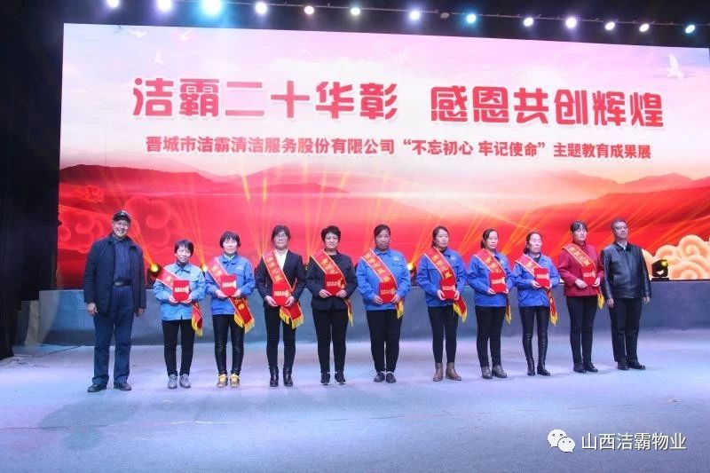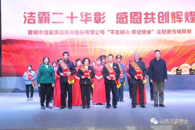 本次晚會(huì)以“潔霸二十華彰,感恩共創(chuàng)輝煌”為主題,此次慶典的核心思想是“感恩”,主要角色是潔霸的創(chuàng)業(yè)者。為此,公司對(duì)入職潔霸的創(chuàng)業(yè)功勛和一線員工進(jìn)行了表彰獎(jiǎng)勵(lì)。本次晚會(huì)共設(shè)8個(gè)獎(jiǎng)項(xiàng),包括“潔霸先鋒”“奉獻(xiàn)之星”“管理之星”“潔霸管家”“潔霸工匠”“清潔之星”“潔霸衛(wèi)士”“園藝之星”等。他們是:李山虎、張永智、史志霞、陳福林、王紅軍、余艷青、劉二丑、成艷粉、楊改梅、王書玲、張國榮、耿竹青、張粉霞、宋秋苗、陳先梅、張晉平、張偉山、趙瑞軍、王廣平、郭志云。晉城市原副市長(zhǎng)成育廷、晉城市商務(wù)局原局長(zhǎng)王新善、晉城市非公和社會(huì)組織工委書記郎軍芳、晉城市婦聯(lián)三級(jí)調(diào)研員李蓮菊、晉城市總工會(huì)商貿(mào)輕紡煙草服務(wù)業(yè)工會(huì)主席張玉濤、晉城市城區(qū)財(cái)政局局長(zhǎng)翟明太等領(lǐng)導(dǎo)為他們頒獎(jiǎng)。