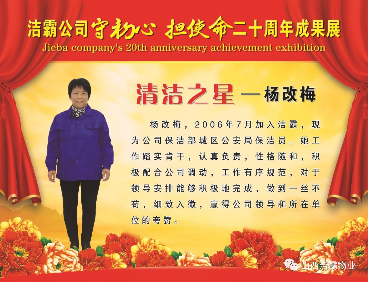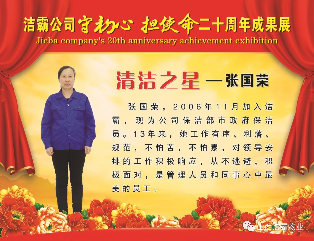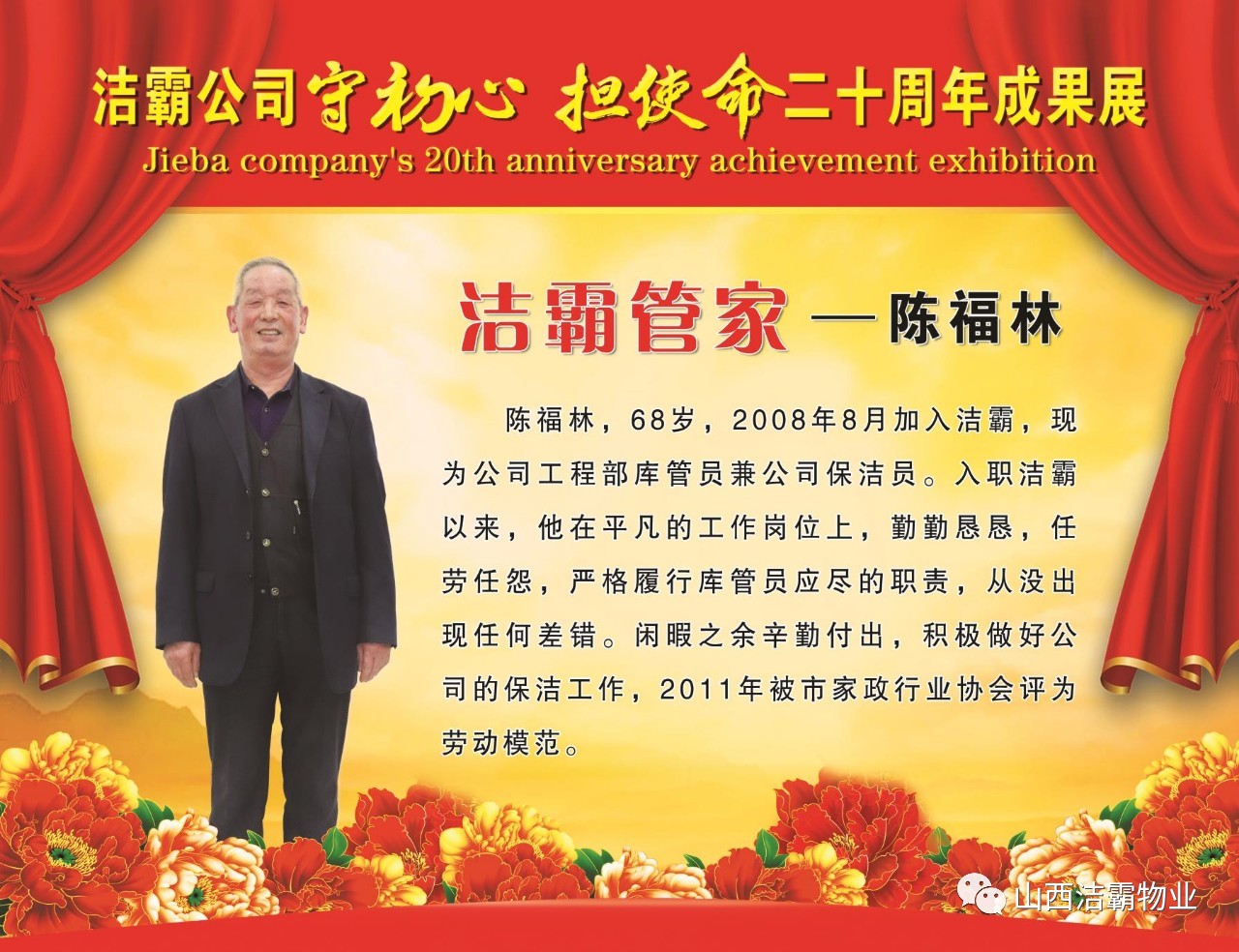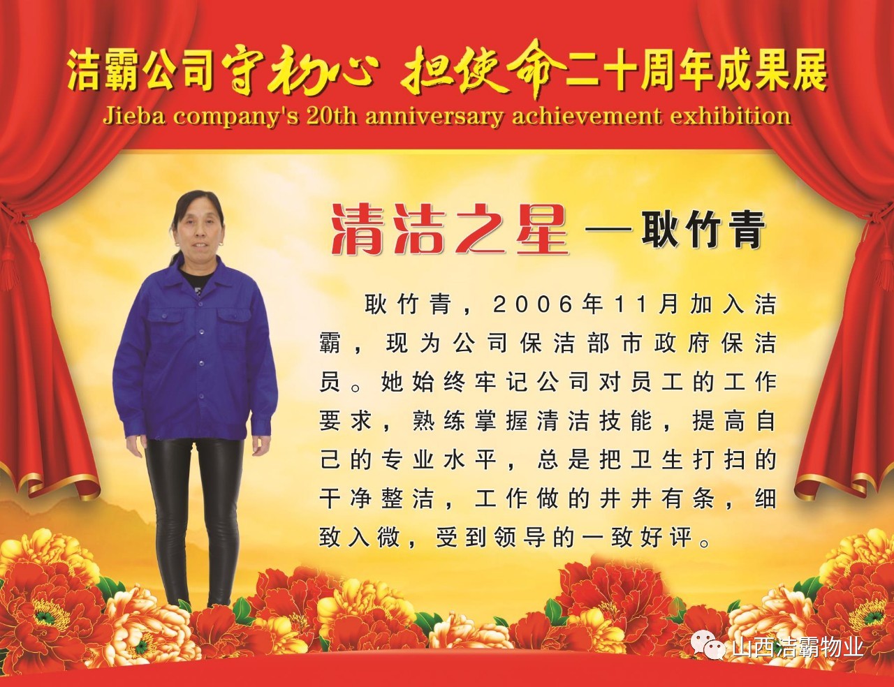 本次晚會(huì)以“潔霸二十華彰,感恩共創(chuàng)輝煌”為主題,此次慶典的核心思想是“感恩”,主要角色是潔霸的創(chuàng)業(yè)者。為此,公司對(duì)入職潔霸的創(chuàng)業(yè)功勛和一線員工進(jìn)行了表彰獎(jiǎng)勵(lì)。本次晚會(huì)共設(shè)8個(gè)獎(jiǎng)項(xiàng),包括“潔霸先鋒”“奉獻(xiàn)之星”“管理之星”“潔霸管家”“潔霸工匠”“清潔之星”“潔霸衛(wèi)士”“園藝之星”等。他們是:李山虎、張永智、史志霞、陳福林、王紅軍、余艷青、劉二丑、成艷粉、楊改梅、王書玲、張國榮、耿竹青、張粉霞、宋秋苗、陳先梅、張晉平、張偉山、趙瑞軍、王廣平、郭志云。晉城市原副市長(zhǎng)成育廷、晉城市商務(wù)局原局長(zhǎng)王新善、晉城市非公和社會(huì)組織工委書記郎軍芳、晉城市婦聯(lián)三級(jí)調(diào)研員李蓮菊、晉城市總工會(huì)商貿(mào)輕紡煙草服務(wù)業(yè)工會(huì)主席張玉濤、晉城市城區(qū)財(cái)政局局長(zhǎng)翟明太等領(lǐng)導(dǎo)為他們頒獎(jiǎng)。