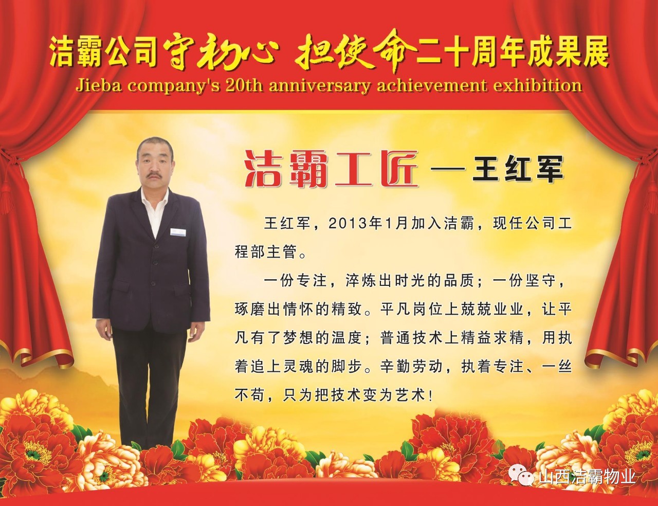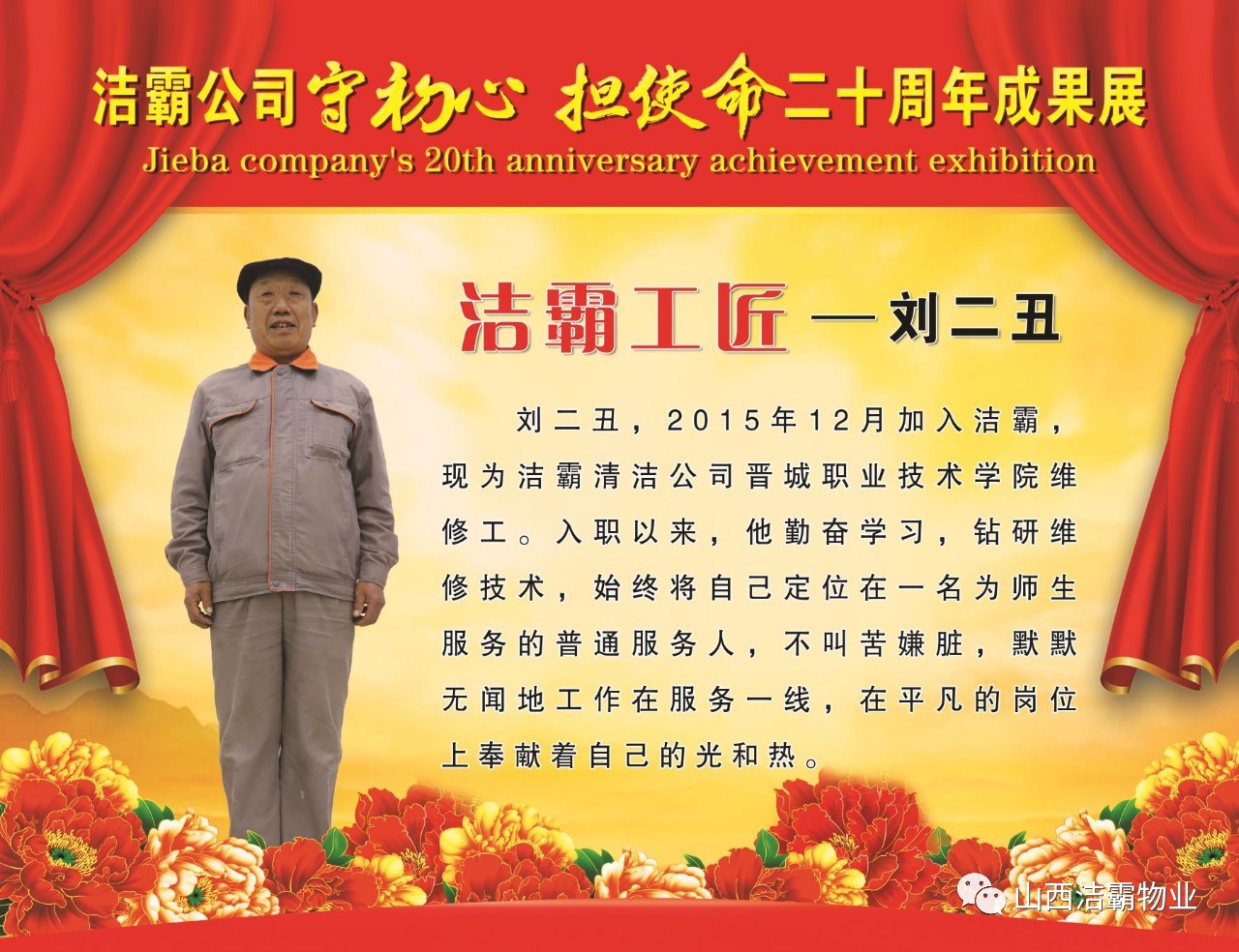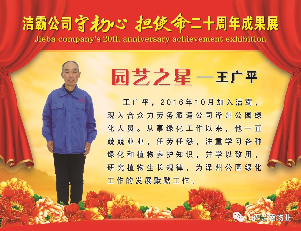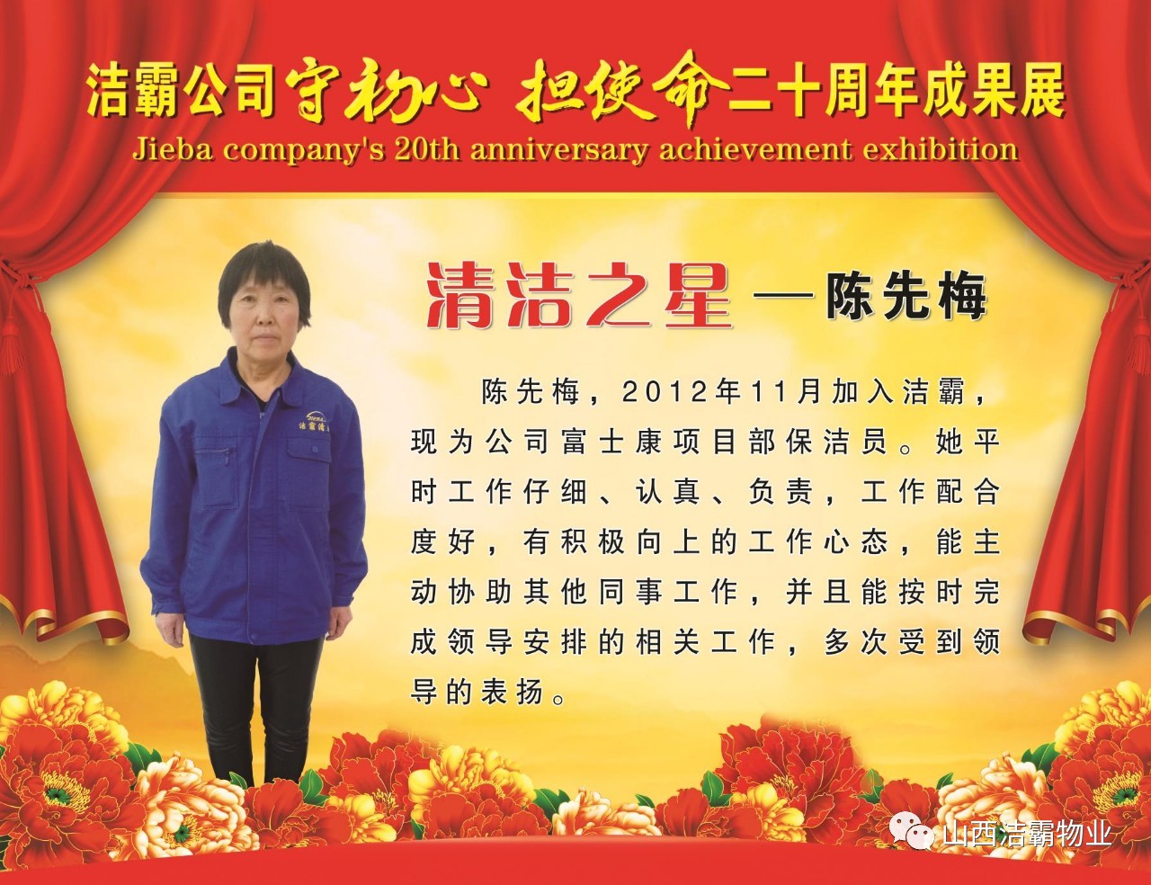 本次晚會(huì)以“潔霸二十華彰,感恩共創(chuàng)輝煌”為主題,此次慶典的核心思想是“感恩”,主要角色是潔霸的創(chuàng)業(yè)者。為此,公司對(duì)入職潔霸的創(chuàng)業(yè)功勛和一線員工進(jìn)行了表彰獎(jiǎng)勵(lì)。本次晚會(huì)共設(shè)8個(gè)獎(jiǎng)項(xiàng),包括“潔霸先鋒”“奉獻(xiàn)之星”“管理之星”“潔霸管家”“潔霸工匠”“清潔之星”“潔霸衛(wèi)士”“園藝之星”等。他們是:李山虎、張永智、史志霞、陳福林、王紅軍、余艷青、劉二丑、成艷粉、楊改梅、王書玲、張國榮、耿竹青、張粉霞、宋秋苗、陳先梅、張晉平、張偉山、趙瑞軍、王廣平、郭志云。晉城市原副市長(zhǎng)成育廷、晉城市商務(wù)局原局長(zhǎng)王新善、晉城市非公和社會(huì)組織工委書記郎軍芳、晉城市婦聯(lián)三級(jí)調(diào)研員李蓮菊、晉城市總工會(huì)商貿(mào)輕紡煙草服務(wù)業(yè)工會(huì)主席張玉濤、晉城市城區(qū)財(cái)政局局長(zhǎng)翟明太等領(lǐng)導(dǎo)為他們頒獎(jiǎng)。