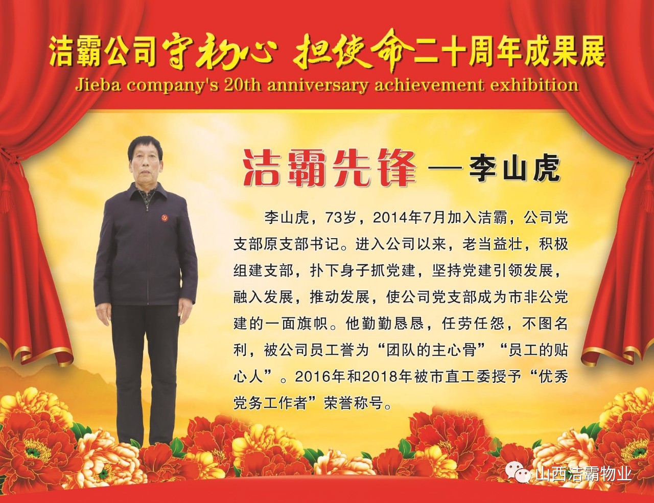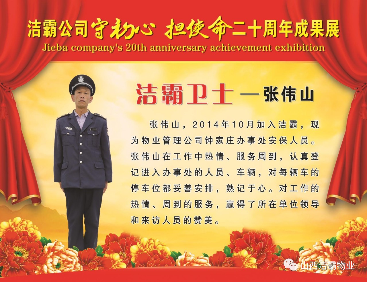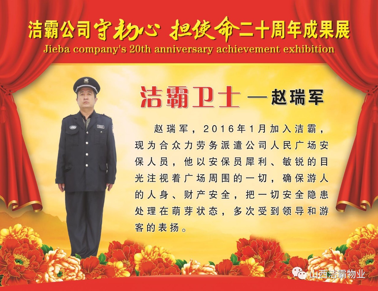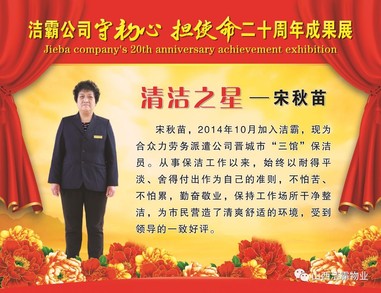 本次晚會(huì)以“潔霸二十華彰,感恩共創(chuàng)輝煌”為主題,此次慶典的核心思想是“感恩”,主要角色是潔霸的創(chuàng)業(yè)者。為此,公司對(duì)入職潔霸的創(chuàng)業(yè)功勛和一線員工進(jìn)行了表彰獎(jiǎng)勵(lì)。本次晚會(huì)共設(shè)8個(gè)獎(jiǎng)項(xiàng),包括“潔霸先鋒”“奉獻(xiàn)之星”“管理之星”“潔霸管家”“潔霸工匠”“清潔之星”“潔霸衛(wèi)士”“園藝之星”等。他們是:李山虎、張永智、史志霞、陳福林、王紅軍、余艷青、劉二丑、成艷粉、楊改梅、王書玲、張國榮、耿竹青、張粉霞、宋秋苗、陳先梅、張晉平、張偉山、趙瑞軍、王廣平、郭志云。晉城市原副市長(zhǎng)成育廷、晉城市商務(wù)局原局長(zhǎng)王新善、晉城市非公和社會(huì)組織工委書記郎軍芳、晉城市婦聯(lián)三級(jí)調(diào)研員李蓮菊、晉城市總工會(huì)商貿(mào)輕紡煙草服務(wù)業(yè)工會(huì)主席張玉濤、晉城市城區(qū)財(cái)政局局長(zhǎng)翟明太等領(lǐng)導(dǎo)為他們頒獎(jiǎng)。