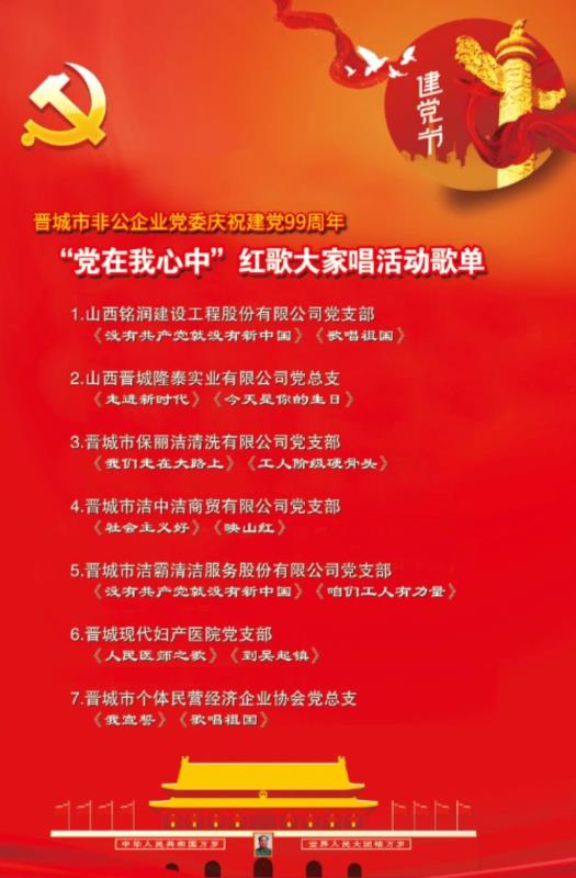 為了慶祝中國(guó)共產(chǎn)黨建黨99周年,6月28日,晉城市非公企業(yè)黨委在澤州天泰錦辰煤業(yè)有限公司組織開(kāi)展了“黨在我心中”紅歌大家唱活動(dòng),潔霸清潔黨支部全體黨員及公司骨干參加演唱活動(dòng)。