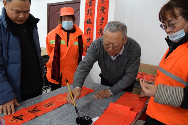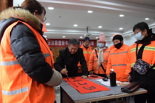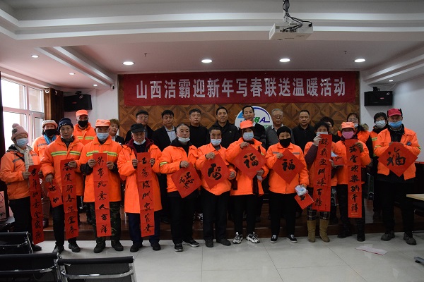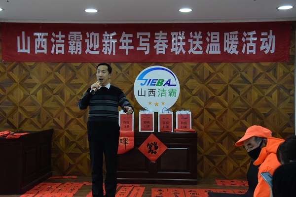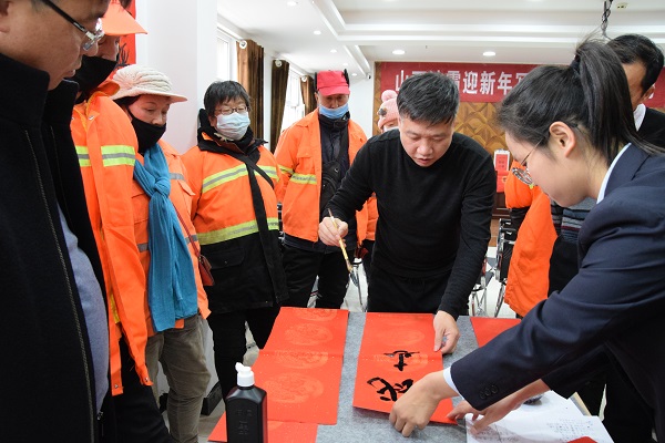 現(xiàn)場人頭攢動(dòng),熱鬧非凡,處處洋溢著歡樂喜慶的氣氛。賈大一老師剛執(zhí)墨筆,就吸引了現(xiàn)場數(shù)十名員工駐足觀賞。他的書法如行云流水,一副寓意著對新年美好祝福的春聯(lián)便一氣呵成。各位老師揮毫潑墨,一幅幅散發(fā)著清新墨香的春聯(lián)展現(xiàn)在大家面前!懊坊í(jiǎng)”獲得者張保平老師現(xiàn)場演唱上黨梆子戲曲名段,字正腔圓,渾厚豪邁,把活動(dòng)推向了高潮。市總工會(huì)副主席韓敦峰為員工分發(fā)了對聯(lián)和防疫口罩。