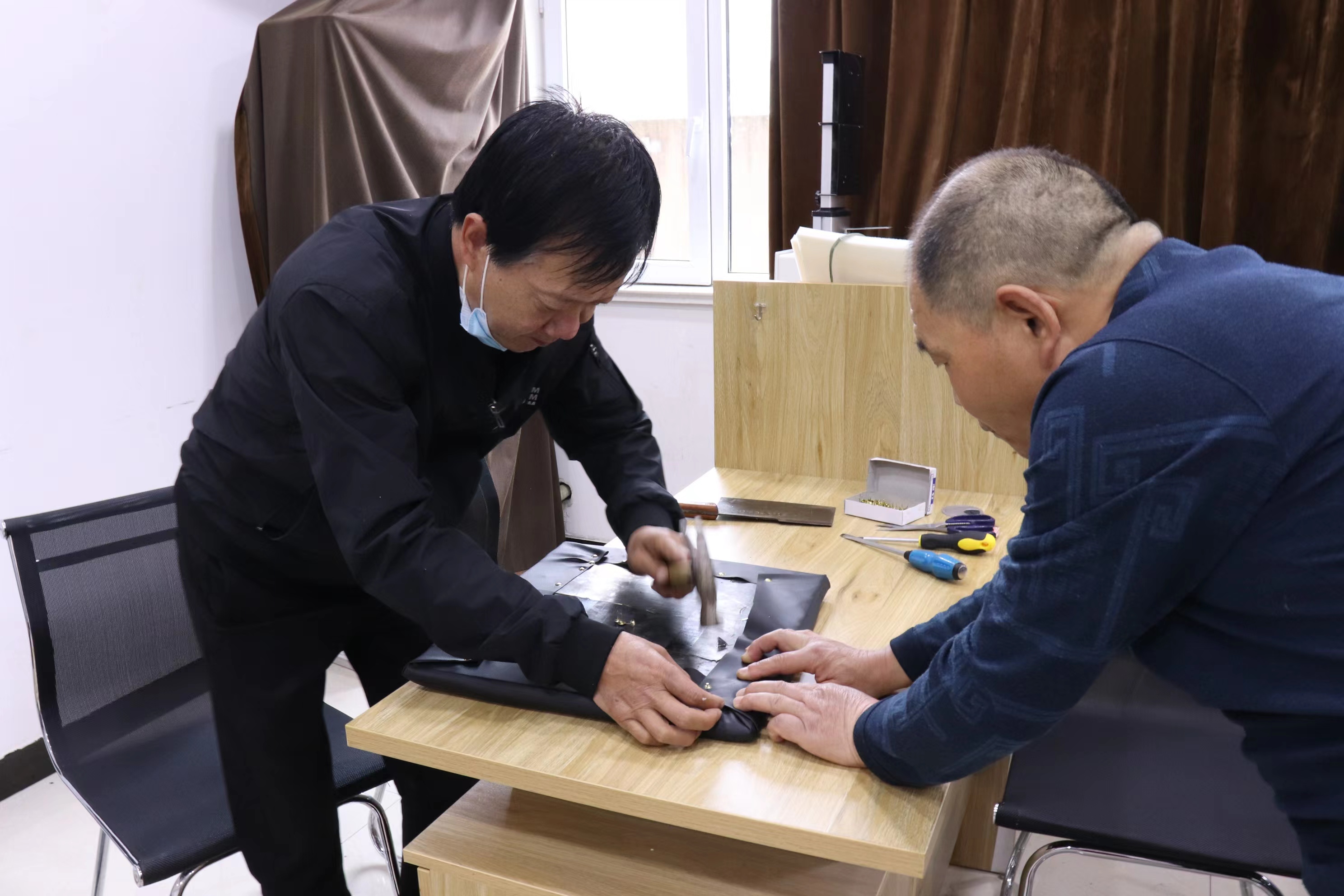 說干就干。他們買來了海綿 、面料 、釘子,憑借衛(wèi)師傅以前的木工技術和田師傅現有的維修技能,對破損的椅子進行了集中維修。叮叮當當……敲敲打打,手腳并用,不亦樂乎……