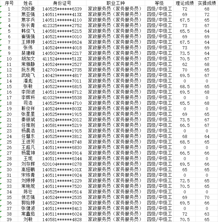 晉城市潔霸清潔服務股份有限公司職業(yè)技能等級認定中心2024年1月28日第8批家政服務員中級認定人員成績公示