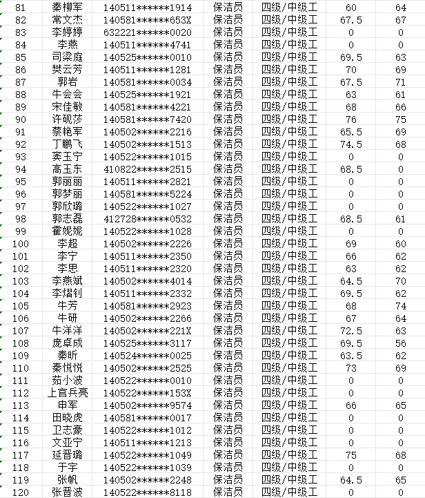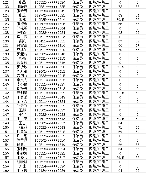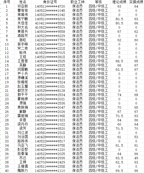 晉城市潔霸清潔服務(wù)股份有限公司職業(yè)技能等級(jí)認(rèn)定中心現(xiàn)將2024年2月3日認(rèn)定人員成績(jī)公示如下: