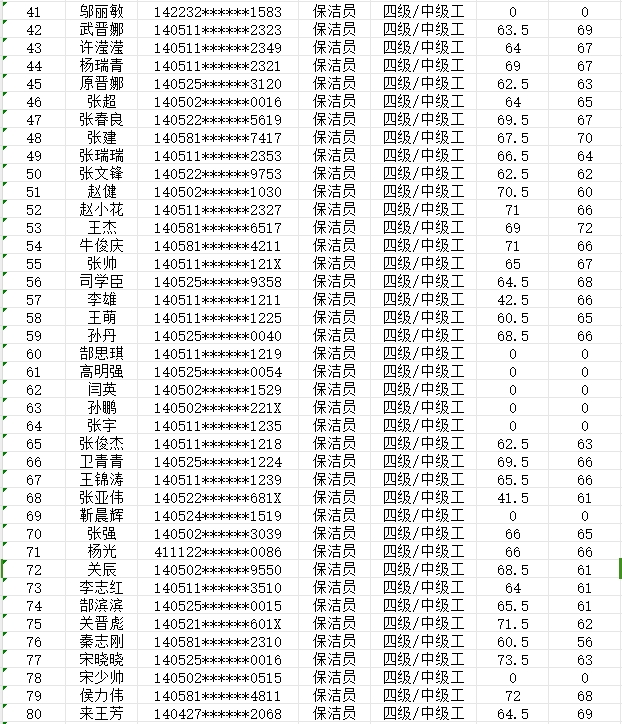 晉城市潔霸清潔服務(wù)股份有限公司職業(yè)技能等級(jí)認(rèn)定中心2024年2月3日第9批保潔員中級(jí)認(rèn)定人員成績(jī)公示
