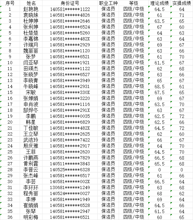 晉城市潔霸清潔服務(wù)股份有限公司職業(yè)技能等級認定中心現(xiàn)將2024523日認定人員成績公示如下: