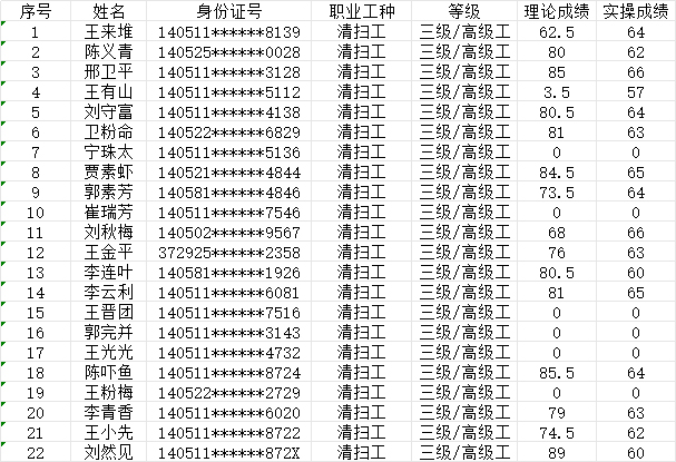 晉城市潔霸清潔服務(wù)股份有限公司職業(yè)技能等級認(rèn)定中心2024年6月23日第3批保潔員高級認(rèn)定人員成績公示