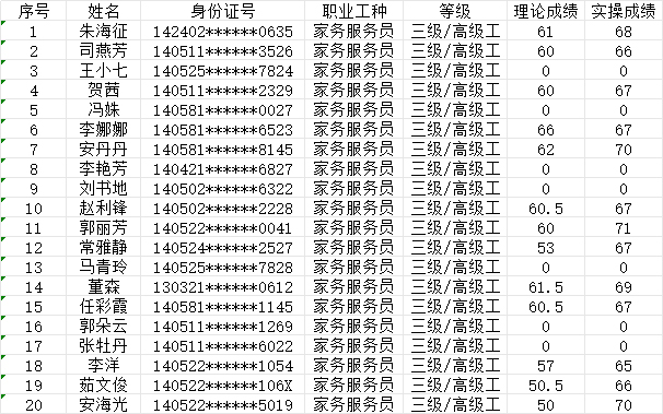 晉城市潔霸清潔服務(wù)股份有限公司職業(yè)技能等級(jí)認(rèn)定中心現(xiàn)將2024年7月14日認(rèn)定人員成績(jī)公示如下: