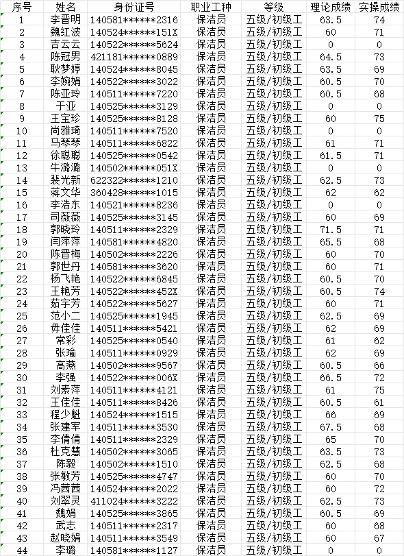 晉城市潔霸清潔服務股份有限公司職業(yè)技能等級認定中心2024年7月21日第23批保潔員初級認定人員成績公示